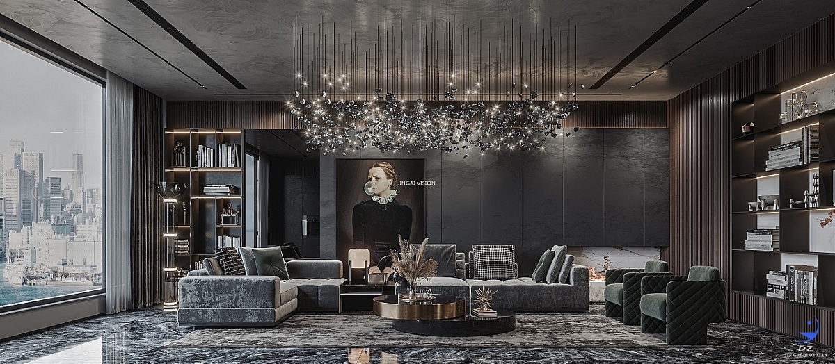 客厅的沙发背景墙在色调上是蓝色与米白色的拼色,蓝色的护墙板中镶嵌线性灯让背景更具现代感和立体感